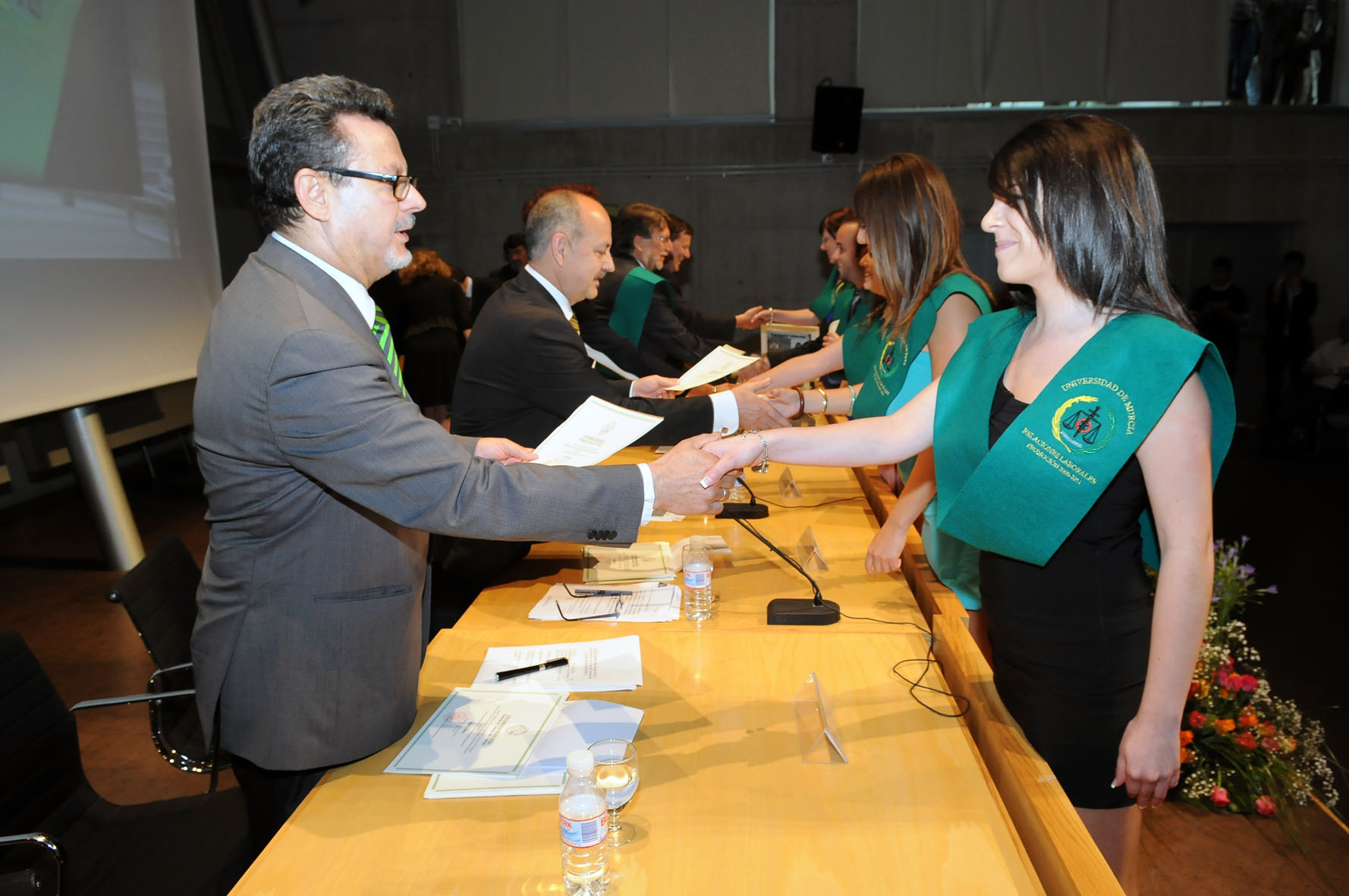 Alumnos de Relaciones Laborales de la Universidad de Murcia , Salón de Actos de la Facultad de Economía y Empresa de la Universidad de Murcia , Esteban Abad, Mª Ángeles. Vicerrectora de Coordinación y Comunicación de la Universidad de Murcia , Manzanares Martínez, Domingo Antonio. Decano de la Facultad de Ciencias del Trabajo de la Universidad de Murcia